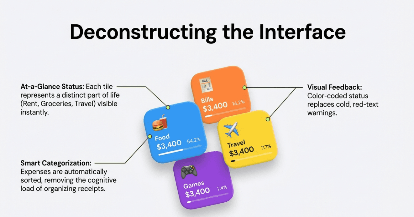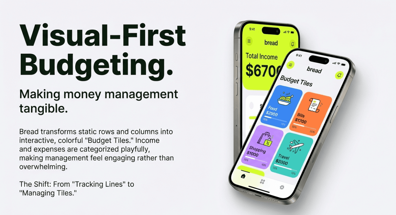 Instead of static spreadsheets, Bread introduced colorful “budget tiles” that showed income, spending, and savings in a way users could understand instantly. Each tile represented a part of their financial life — rent, groceries, travel, subscriptions — all visible at a glance.